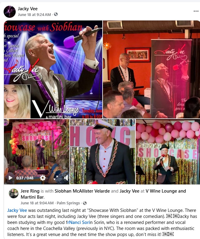 On June 17, 2025 I had the privilege of perfoming at the Showcase with Siobhan event hosted by Siobhan McAllister Velarde at the V Wine Lounge and Martini Bar in Palm Springs, California. It was a great event and an even more memorable experience. I’ve included some videos of my performance below. I hope you enjoy.